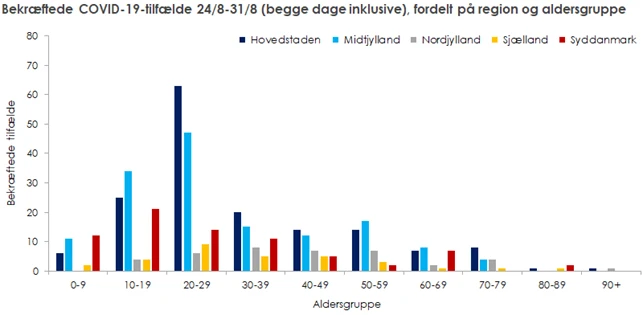 Af figuren fremgår, at en stor del af den sidste uges tilfælde særligt i Region Hovedstaden og Region Midtjylland, er i aldersgrupperne 20-29 år og 10-19 år.